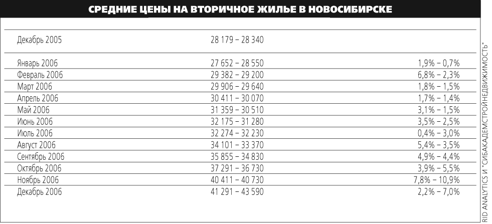 По данным АН “Сибакадемстройнедвижимость”, жилье за прошедший год подорожало на 53,8%. По итогам декабря самые дорогостоящие квартиры предлагались в Железнодорожном районе — по цене 53 200 руб. за 1 кв. м. Традиционно дорогой Центральный район оказался на 2-м месте — цена 1 кв. м составила здесь 50 000 руб. Самое дешевое жилье — по 29 800 руб. за 1 кв. м — продавалось в Первомайском районе. По данным агентства RID Analytics, в декабре 2006 г. средние цены предложения на вторичном рынке по сравнению с декабрем 2005 г. выросли на 47%. Средняя цена 1 кв. м в декабре 2006 г. составила 41 291 руб. против 28 179 руб. за 1 кв. м в декабре 2005 г. В течение года цены на жилье в среднем повышались на 1000 руб. в месяц.