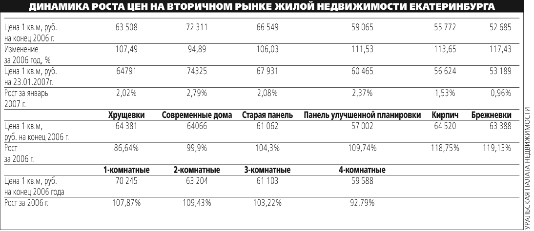 За 2006 г. цены на вторичном рынке жилой недвижимости Екатеринбурга выросли на 107%. На конец декабря 1 кв. м стоил в среднем 63 00 руб. В январе нынешнего года цены предложения выросли на 2%. Такой же умеренный рост аналитики прочат как минимум на весь I квартал, максимум — на весь 2007 год.