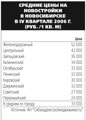 По данным АН “Сибакадемстройнедвижимость”, в IV квартале 2006 г. средняя цена квартир в новосибирских новостройках составила 33 630 руб. за 1 кв. м, на окраинах жилье продавалось в среднем по 20 000 руб. за 1 кв. м, а в центре города — по 55 000 руб. за 1 кв. м. Самыми дорогими квартирами были наиболее ликвидные однокомнатные: за 1 кв. м в них просили 35 030 руб. Двухкомнатные обходились покупателям по 33 300 руб. за 1 кв. м, цена 1 кв. м в трехкомнатных была равна 32 320 руб.