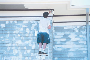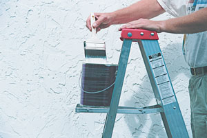 Для начала работ, нужно запастись необходимым рабочим инвентарем: лестница, строительные леса, щетки для пыли и мытья, резиновые перчатки, скребок и стальная щетка для удаления старой краски, рабочие рукавицы, защитная пленка, тканевая маска, наждачная бумага, шлифовальный брусок, приспособление для открывания банок с краской, палочка для перемешивания краски, кисти.