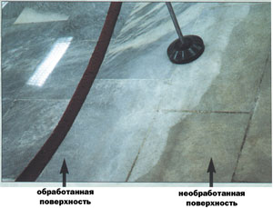 МОЮЩИЕ СРЕДСТВА Следует отметить, что моющие средства отличаются высокой биохимической активностью (иначе они просто не будут моющими средствами - В.К.). Они могут вызывать легкое раздражение кожи, и некоторые даже разрушать резину, поэтому при обращении с ними надо соблюдать элементарные меры безопасности: не допускать попадания в глаза и внутрь организма. Беречь от детей. Моющее средство «BERT 27» (SUPER DEOXIDIZER «BERT-27») Концентрат моющего вещества для удаления грязи с каменных фасадов зданий. Обладает антисмольными характеристиками (против дымов, копоти и т.д.). Описание: очень концентрированное моющее средство на базе кислоты для гранита, цемента, фарфора, глины. Этот препарат очищает материал от любого вида неорганической грязи, а также очищает от ржавчины. Инструкция по применению: препарат следует развести в отношении 10-20 мл препарата на один литр воды (для более сильных загрязнении концентрация может быть увеличена). Для удаления грязи нанесите на всю поверхность раствор, состоящий из воды и моющего средства. Дождитесь впитывания раствора. Промойте поверхность водой до исчезновения следов раствора. Не используйте на полированном мраморе. Расход: 1 литр на 70 м2. Моющее средство LEM-3 Концентрат нейтрального негорючего моющего вещества для удаления грязи с поверхности природного камня, керамики, терраццо. Рекомендации: концентрированное моющее средство для очистки любых поверхностей специально предназначено для обработки мрамора и гранита. Лучший препарат для подготовки поверхности перед нанесением защитных восков. Инструкция по применению: Очистите поверхность от сухой грязи. Для удаления обычной грязи протрите всю поверхность раствором, состоящим из воды и моющего средства в отношении 10 к 1. Промойте поверхность водой до исчезновения следов раствора. Для очень сильного загрязнения используйте LEM-3 с меньшим разбавлением (1 к 5). Тщательно промойте загрязненную поверхность, дождитесь полного высыхания. После этого поверхность готова для нанесения воскового защитного покрытия. Расход: 1 литр примерно на 130 м2. при средней загрязненности. Шампунь - удалитель восков DECER-DOC. Концентрированное моющее средство нейтрального состава для очистки мрамора, гранита, керамики и всех видов камня. Удаляет восковые покрытия и отложения грязи без разрушения полировки. Рекомендации по применению: для удаления небольших восковых пленок добавьте 10-20 мл препарата на 1 литр воды и очищайте поверхность вручную или полотером. Для удаления старых и впитавшихся восков добавьте 50 мл препарата на 1 литр воды и очищайте поверхность. После очистки промойте обработанную поверхность водой. После высыхания поверхность готова к обработке новыми восками. Расход: 1 литр на 50-100 м2 в зависимости от слоя старых восков. Полироль-очиститель «L&L» Полироль для легкого и быстрого ухода за полами из натурального камня. Удаляет грязь с поверхности гранита, мрамора, керамики, терраццо. Используется для ухода за полами покрытыми натуральными восками или без них. Рекомендации по применению: лучший препарат для ухода за каменными полами. Инструкция по применению. Подготовьте раствор препарата с водой в отношении 1 к 30-50 (в зависимости от загрязнения поверхности). Нанесите аккуратно и ровно мягкой, чистой тряпкой полученный раствор на обрабатываемую поверхность. После по