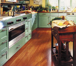 В общем, весь секрет в том, что к поверхности пола просто не прилипает грязь и пыль, и потому содержать его в чистоте не сложно. При обычной уборке Вам кроме влажной тряпки и пылесоса ничего не понадобится. Ну а если на пол попал лак для ногтей, паста от шариковой ручки, концентраты соков, вам потребуется небольшое количество ацетона или домашнего моющего средства, чтобы удалить эти пятна. И не надо покрывать пол ни лаком, ни мастикой. Так как толщина пола составляет всего 8 мм, он может быть настелен прямо на старый пол. При этом Вам не придется менять двери и «подгонять» пороги. Ламинат может быть настелен на древесноволокнистую или древесностружечную плиту, линолеум и другие настилы. Его можно класть на пол с подогревом. Даже, если Вы не специалист, Вы сможете уложить паркет сами, достаточно изучить инструкцию. «Плавающие (подвижные) полы» являются основной концепцией при укладке практически всех ламинированных полов. «Плавающий пол» не надо прибивать гвоздями или приклеивать к нижнему полу, чтобы сделать его неподвижным. Планки скрепляются в соответствии с инструкцией так, что они образуют единую поверхность, нескрепленную с основанием. Преимущества «плавающего пола» можно сформулировать следующим образом: Ёпростейшая установка; Ёпотребность в клее только в местах соединения; Ёпрекрасно настилается на старые полы; Ёповрежденный участок очень просто заменить. Перго выпускает несколько классов продукции: Первый из них - это «PERGO ORIGINAL» (о нем мы подробно и рассказывали). Класс 23 и 31. Гарантия 15 лет. Цена - $29/м2. Второй - «PERGO SELECT». Толщина 11 мм. Класс 32 (самый высокий класс). Гарантия 20 лет. Выпускается в 12 цветах. Цена $38/м2. Третий - «NORD STEP». Толщина 7 и 8 мм. Класс 23. Выпускается в 6 цветах. Цена ~ $19/м2. Четвертый - «PERGO FAMILY». Класс 23. Гарантия 10 лет. На паркете «PERGO FAMILY» стоит остановиться особо, т.к. собирается он не по уже описанной «клеевой» технологии, а с помощью бесклеевой системы «КликЛок». Собирается такой паркет еще проще и быстрее, прежде всего благодаря особой конструкции кромок. Кромки просто захлопываются друг за друга и при этом и излают характерный звук - «клик». (Отсюда и произошло название паркета). И все! У таких полов есть и еще одно неоспоримое преимущество - их можно разобрать и перевезти на новое место. Поменяли квартиру, сняли другой офис попросторнее. Нет проблем. Снимаем паркет на старом месте, грузим с собой в машину и монтируем на новом месте. Если не хватило досок - идем и докупаем необходимое количество. Все очень просто. Второй ламинированный паркет, который мы сегодня рассмотрим - паркет фирмы «NOVOFLOOR» (Испания). Этот паркет неплохо зарекомендовал себя на российском рынке. Он сочетает довольно высокое качество и невысокую цену. Схематично его структура представлена на рисунке справа. Укладка «NOVOFLOOR» производится описанным выше «плавающим» методом, то есть без приклеивания к основе. Он хорошо стыкуется в пазах, не образуя щелей. При эксплуатации, благодаря своей слоистой конструкции, «NOVOFLOOR» не рассыхается, не скрипит, не выгорает, не меняет цвет. Ухода он практически не требует - обычная влажная уборка или уборка пылесосом. Не нуждается в циклевке и лакировке. Большое разнообразие цветов и оттенков натурального дерева и авангард удовлетворят самый изысканный вкус. Цвета: ЁБук светлый и темный; ЁДуб светлый и темный; ЁВ