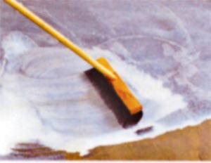 К нанесению основного слоя приступают примерно через сутки после нанесения грунтовки в зависимости от температуры. Для увеличения толщины рабочего слоя, а также, там, где имеются зоны повышенных механических нагрузок, используют сухой кварцевый песок.