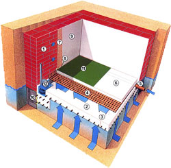 Меры предосторожности Сухие грунты (легкие песчаные и супесчаные) не должны сильно переувлажняться, иначе неизбежно не только вертикальное, но и горизонтальное перемещение влаги. Весной с крыши стекают потоки воды, поэтому, чтобы избежать увлажнения грунта вокруг дома, необходимо сделать отмостку и водоотведение (как с крыши, так и от самого здания). С помощью подобных мероприятий удастся защитить постройки от почвенной влаги. Обычно влажные грунты имеют тяжелый механический состав, они представлены суглинками и глинами, которые обладают высокой влагоемкостью и очень неохотно расстаются со своей влагой. В этом случае наружные поверхности стен подвала рекомендуется оштукатурить цеметно-известковым раствором, а после просушки дважды покрыть горячим битумом или оклеить рулонным ковром из гидроизоляционных материалов. В очень влажных грунтах к цементному раствору добавляют церезит, уплотняющие растворы и бетон либо применяют специальные цементы типа Гидро-С, Гидро-ВС или аналогичные. Сегодня на рынке представлено множество гидроизолирующих материалов, которыми обрабатывают поверхность штукатурки для усиления водонепроницаемости. Для этой же цели используют оклеечные материалы, изготовленные на базе полимеризованного битума, наклеиваемого горячим способом. Срок их службы составляет 25 -35 лет. К оклеечным материалам, наиболее широко применяемым в настоящее время, можно отнести стеклоизол, наклеиваемый холодным способом. Более надежны стеклоэласт и рубитекс на основе полимеризованного битума. Они наклеиваются горячим способом и имеют срок службы 20-25 и 25-35 лет соответственно. Появились также новые сухие гидроизолирующие смеси для внешних и внутренних работ. В том числе акватрон-6 глубокого проникающего действия. Эта смесь быстро схватывается и имеет (по данным фирм-распространителей) срок службы до 100 лет. Для заделки отдельных отверстий и трещин применяют акватрон-8, схватывающийся в течение пяти секунд. Стоит обратить внимание на комплекс совместимых друг с другом гидроизоляционных материалов итальянской компании Index. Например, состав Osmoseal предназначен для гидроизоляции подвалов и защиты стен от сырости. Он представляет собой сухую смесь, затворяемую водой. После нанесения на поверхность бетона, штукатурки и т.д. состав всасывается и образует нерастворимые кристаллы, закупоривающие капилляры строительных конструкций. Для выравнивания гидроизолируемой поверхности применяют ремонтные растворы Resisto Tixo И Resisto Tixo Rapid 15 влагонепроницаемые безусадочные смеси на основе цемента, армированные синтетическими волокнами. Без опалубки наносят слой до 40 мм толщиной. Уровень воды может подняться выше пола подвала, если причиной подтопления становятся верховодка или грунтовые воды. Для борьбы с этим явлением устраивают дренаж, что при строительстве дома не только целесообразно, но и достаточно экономично. Дренаж эффективен и в том случае, когда дом уже построен (правда, тогда это будет дороже). В коттеджном строительстве, как правило, применяют горизонтальный трубчатый дренаж совершенного типа, полностью прорезающий водоносный горизонт и доходящий до водоупора, а также несовершенного типа, прорезающий этот горизонт лишь частично. По форме дренаж может быть отсекающим (перехватывает поток грунтовых вод с верхней стор