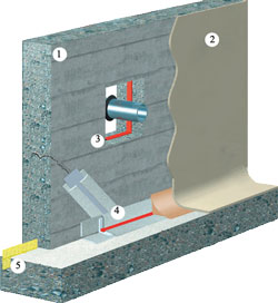 betonrapid быстросхватывающийся цемент для аварийной ликвидации протечек даже в условиях постоянного водопритока. Применяется в тех случаях, когда отсутствие адекватной гидроизоляции фундамента или существование гидростатического давления водоносного слоя приводит к инфильтрации грунтовых вод через щели и трещины. Время схватывания 30-60 секунд. Через час после блокирования протечки поверхность покрывают гидроизолирующим раствором. RESISTO TIXO - безусадочный раствор, армированный синтетическими волокнами с улучшенными связывающими свойствами. Применяется для ремонта бетонных поверхностей, поврежденных вследствие нарушения гидроизоляции, а также для выравнивания и формирования на вертикальных поверхностях слоя большой толщины без использования опалубки. OSMOSEAL - осмотический гидроизолирующий цемент. Позволяет решить проблему гидроизоляции изнутри, без проведения работ по восстановлению внешней гидроизоляции. Взаимодействуя с компонентами бетона, образует твердые нерастворимые кристаллы, осмотически закрывающие капиллярную сеть обрабатываемой поверхности. При гидроизоляции объектов, подверженных вибрации и динамическим нагрузкам, используют эластичное гидроизолирующее покрытие OSMOLASTIC. EXPAN BENTONITICO - водорасширяющийся шнур из бентонитовой резины. Используется для герметизации конструкционных и ?холодных? швов в бетоне. При контакте с водой шнур увеличивается в объеме, создавая самозаполняющийся водонепроницаемый барьер. Обладает повышенной эластичностью.