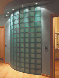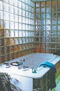 Стеклоблоки используют в основном для строительства ненесущих стен. В силу названных свойств их традиционно используют на предприятиях и в организациях, когда нельзя поставить обычные окна в рамах. Довольно часто нам приходится их видеть в проемах на лестничных площадках. Стеклоблок отлично «ладит» с влагой, поэтому он особенно хорош в спортивных комплексах, раздевалках, бассейнах, банях. Однако отойдем от практических свойств стеклоблоков и обратимся к его эстетическим возможностям.