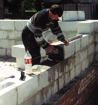 Использование для строительства блоков из ячеистого бетона накладывает определенные требования на использование всех остальных материалов. Поскольку блоки отличаются высокой паропроницаемостью, то и все соприкасающиеся с ними материалы - грунты, шпатлевки, штукатурные и окрашивающие смеси тоже должны быть паропроницаемыми. И разработаны они должны быть , так сказать, специально, для работы в паре с ячеистым бетоном. Например, если рассматривать систему внешней отделки, то каждый последующий материал, накладываемый на ячеистый должен быть более паропроницаемым, чем предыдущий, чтобы скорость прохождения пара через него была не меньше, а больше, чем у предыдущего слоя. Иначе выходящий пар начнет отслаивать менее проницаемый слой, мешающий его проходу. И любой из применяемых материалов должен отличаться высокой адгезией к основанию. Кстати, именно поэтому при отделке обычными растворами или смесями через 1,5-2 года происходит «шелушение» и отслаивание наружной штукатурки и растрескивание внутренней. Конечно же, для строительной фирмы или частного застройщика, строящих дом из ячеистого бетона, бегать по разным фирмам и приобретать у одной - штукатурку, у другой - шпатлевку, у третьей - кладочную смесь страшно неудобно, потому как это дело долгое и неблагодарное. Кроме того, при таком способе покупки никогда не можешь быть уверен, что каждый из купленных материалов на 100% сочетается с другими и все они вместе полностью сочетаются с ячеистым бетоном и его специфическими свойствами. (Кстати, заметим, что многие системы материалов внешней и внутренней отделки, выпускаемые разными производителями, действительно не сочетаются между собой.) И потому для застройщика было бы выгодно приобретать все необходимые материалы для строительства и отделки как бы в комплексе - с гарантией, что все они между собой сочетаются и для осуществления намеченной цели полностью подходят. Совсем недавно представители нашей фирмы просто методично объехали практически все отечественные фирмы, производящие сухие смеси. И ни на одной из них нам не смогли предложить полного комплекса материалов для работы с ячеистым бетоном. Единственной фирмой, предлагающей все необходимые материалы в комплексе, на сегодняшний день на нашем рынке является «РАДЕКС». Примерно так же как «ТИГИ-КНАУФ» является на нашем рынке единственной фирмой, производящей полный комплекс материалов, необходимых для работы с гипсокартонными и гипсоволокнистыми листами. «Радекс», как Вы сами могли убедиться, предлагает все - от клея для кладки до материалов для окончательной отделки. И каждый из предлагаемых материалов системы хорошо продуман и даже, если хотите, незаменим. Давайте для примера рассмотрим тот же клей для кладки блоков из ячеистого бетона. Если блок имеет правильные геометрические размеры (их отклонения не превышают ±1 мм), то необходимость в применении стандартных кладочных смесей, имеющих толщину слоя в кладке не менее 1 см, просто отпадает. (Кстати, напомню, что толстый слой раствора является мостиком холода.) Блоки с такими отклонениями линейных размеров можно укладывать на более тонкий слой раствора - 1-2 мм, с тем, чтобы кладка получилась более монолитной. И добиться этого можно только применяя клей. Применение клея, кроме того, еще и экономически более выгодно, по 