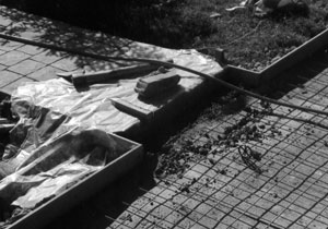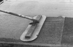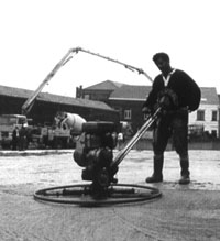 При своем осаждении крупная фракция выдавливает на поверхность более мелкую. Поэтому поверхность обрабатывается специальным роллером (рис. 4). С его помощью мелкие камешки утапливаются. Через какое-то время поверхность заглаживается: на больших площадях специальной "гладилкой" (рис. 5), при небольших площадях и в местах примыкания заглаживание производится небольшой ручной гладилкой. Для чего необходима столь тщательная подготовка поверхности? Прежде всего для того, чтобы на поверхности осталось только так называемое "бетонное молочко". Ведь работать в дальнейшем нам предстоит только с поверхностью - "штамповать", красить и т.д. А крупная и средняя фракции будут портить "штампованную" поверхность. Те подготовительные операции, о которых мы уже рассказали, проводятся, так скажем, на ровной площадке. Если работы производятся вплотную к дому, например при устройстве отмостки, то в подготовительные работы надо еще включить устройство усадочных швов. Дело в том, что хотите Вы этого или нет, бетон при застывании будет менять свои геометрические размеры - дает усадку. И если он вплотную уложен к стене, то рядом со стеной будут образовываться трещины. То есть бетон необходимо отделить от стены с помощью упругой прокладки (толщиной 3-5 мм), например из пенополиэтилена. Такая прокладка дает бетону свободно "дышать" и таким образом препятствует появлению трещин. После окончания работ лишний пенополиэтилен срезается, а усадочный шов заполняется герметиком. После выполнения всех подготовительных операций необходимо выждать пока с поверхности бетона уйдет избыточная вода, а поверхность бетона из глянцевой станет матовой. Как только поверхность бетона готова, в неё втирается краска, точнее цветной отвердитель поверхности (рис. 6). Он придает бетону поверхностную прочность и износостойкость и одновременно окрашивает её в желаемый цвет. После того, как цветной отвердитель равномерно распределен по поверхности бетона, поверхность заглаживается (рис. 7). В тех местах, где выявилась неравномерность окрашивания, операции повторяются. После того как поверхность бетона застынет до такого состояния, что палец, надавливающий на бетон, в него не погружается, а оставляет только легкую вмятину, на поверхность наносится специальный реагент (рис. 8). Он представляет собой черный гидрофобный порошок. Этот порошок выполняет сразу несколько функций. Во-первых, он не позволяет матам, с помощью которых в дальнейшем будет производиться "штамповка" прилипать к поверхности бетона. Во-вторых, он, являясь гидрофобным, препятствует испарению влаги с поверхности бетона, что не позволяет растрескиваться поверхности. (Напомним, что обычный бетон в этот момент накрывается мешковиной, которая ежедневно поливается водой. Иначе высыхающая поверхность бетона, еще сырого в глубине, может растрескаться.) В-третьх, этот порошок, проникнув в неровности поверхности, даст так называемый вторичный цвет - патину на камне. Но произойдет это уже после штамповки, когда эти самые неровности будут образованы. Ведь натуральный камень одноцветным быть не может - все углубления и швы темнее основной массы. Далее проводится операция штамповки. Производится она с помощью специальных матов, имеющих на поверхности соответствующий рисунок. Мат просто укладывается на бетон и простукивает