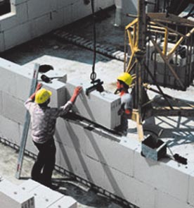 Предприятия производят газобетон разной плотности, и строитель может выбрать нужный ему тип блоков в зависимости от того, какую часть дома он строит. Газобетонные блоки могут иметь плотность от 350 до 700 кг/куб. м и, соответственно, рассчитаны на различное применение. Газобетон наименьшей плотности пригоден для утепления строения и никак не может служить для строительства несущих стен. Последние возводят из материала плотностью 400 500 кг/куб. м. Причем из газобетона плотностью 500 кг/куб. м можно строить дома высотой до трех этажей. Более высокие строения надо возводить, соответственно, из материала еще большей плотности. Тут только следует быть внимательным: чем выше плотность газобетона, тем ниже его теплоизоляционные свойства. Другими словами, чем он плотнее, тем ближе по свойствам к обычному бетону - холодному и аэронепроницаемому материалу. К тому же чем плотнее стена, тем она тяжелее, а значит, требует более мощного фундамента. Поэтому в коттеджном строительстве наиболее ходовым является блок плотностью 400 500 кг/куб. м - именно в нем наиболее оптимально сочетаются выигрышные свойства ячеистого бетона, а также его прочность и масса. Крупные заводы выпускают из газобетона разнообразные армированные изделия и даже специальные плиты перекрытий. Последние, правда, дороже, чем аналогичные конструкции из обычного тяжелого бетона, но зато не требуют слишком большой толщины несущих стен.