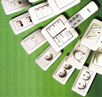 Телефонные розетки (6-ти контактные) со шторками, предохраняющими контактную часть от пыли в отключенном виде. Аудиорозетки предназначены для подключения различных музыкальных и акустических систем. Прежде чем перейти к последнему пункту сегодняшнего обзора - распределительным щиткам, предлагаемым фирмой “Анам”, стоит поговорить о безопасности электроснабжения. Вопрос безопасного электроснабжения в здании подразделяется на два подвопроса: защита людей, эксплуатирующих электрические установки, и защита самих электроустановок. Защита электроустановок - выполняется автоматами, защищающими электроприборы от токов короткого замыкания (всем знакомы российские автоматы типа АЕ и АП). Защита людей, эксплуатирующих электрические установки, - это вопрос защиты от замыкания на землю (корпус) при пробое изоляции (стиральные машины, холодильники, электроплиты и т.д.). Прикоснувшись к такому прибору, человек получает электрический удар, последствия которого плохо непредсказуемы. Одним из способов защиты людей от поражения электрическим током при замыкании на корпус - это дифференциальные автоматы (так их называют на западе) или устройства защитного отключения - УЗО (так их называют в России). УЗО - устройство, которое измеряет разницу между током, проходящим по фазному проводу, и током, "возвращающимся" по нейтральному проводу, точнее измеряющее дифференциальную разность токов. Если возникает разность измеряемых токов, т.е. возникла утечка тока на землю (в частности утечка по телу человека, коснувшегося корпуса неисправного устройства), то именно эту утечку и фиксирует прибор. Безопасным пределом для человека считается ток 30 мА. Соответственно в жилых зданиях и применяются устройства защитного отключения, рассчитанные на ток утечки 30 мА. Время срабатывания (несколько миллисекунд) рассчитано таким образом, что человек даже и не успевает толком понять, что его "тряхнуло". Защита от контактного напряжения и риска поражения электрическим током, обеспечиваемая УЗО, является основополагающим элементом при любом нормальном применении и исключительно важна в особых случаях, когда фактор риска может быть особенно велик (ванные комнаты и т.п.). Защитные устройства типа УЗО, установленные в распределительном шкафу квартиры и используемые в комплекте с автоматом от перегрузки и короткого замыкания успешно защищают всю квартиру или дом. Именно такие распределительные щитки и предлагает фирма “Анам”. Щитки распределительные на 4, 6, 10 линий. В комплект входят: устройство защитного отключения (УЗО), защитные двухполюсные автоматы. Номинальный ток для автоматов: 15, 20, 30 А, для УЗО: 30, 50 А, ток утечки 30 мА. Кроме серии электроустановочного оборудования 70 WIDE, о которой мы довольно подробно рассказали, предлагается серия SUPER WIDE. Электроустановочное оборудование этой серии отличается более прямоугольными формами и наличием металлизированной серебристой накладки на клавишах выключателей. Функционально же оно ни чем не отличается от оборудования серии 70 WIDE. Цвет - слоновая кость. Для тех, кто по каким-то причинам вынужден использовать не внутреннюю, а наружную проводку предлагается серия соответствующего электроустановочного оборудования.