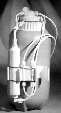 Первая из таких установок - мембранная установка, разработанная в ГНЦ НИИ ВОДГЕО и изготавливаемая фирмой "WATERLAB", созданной на базе ВОДГЕО и кафедры Охраны водных ресурсов МГСУ. Система очистки воды для офиса. В отличие от мембранных установок, предлагаемых другими фирмами, эти установки имеют упрощенную технологическую схему (рисунок справа), и, следовательно, меньшую стоимость. Производительность - до 100 л/сутки Емкость бака - 8-10 л. Размеры: 360х360х150 мм Вес - 6 кг ЦЕНА: - $300. По желанию клиента установка комплектуется ультрафиолетовой лампой для обеззараживания воды (~$150). При использовании в водопроводных сетях с давлением меньше 2,5 атм. Для увеличения производительности целесообразно доукомплектовать установку повысительным насосом (~$100). Для удобства установки монтируются внутри «диспенсера» - блока-контейнера, снабженного баком-накопителем чистой воды, охладителем и проточным кипятильником (вес 29 кг). На передней панели «диспенсера» имеются краны для горячей и холодной воды. Стоимость «диспенсера» с доставкой, установкой и 1 годом гарантии составляет ~ $750. Мембранные установки WATERLAB прошли всесторонние гигиенические испытания и имеют гигиенический сертификат. Доставка, монтаж и обслуживание установок производится специалистами фирмы WATERLAB. Установки автоматизированы и не требуют никакой подготовки к эксплуатации. Обслуживание установки заключается в регулярной замене ингибиторного патрона и мембранного фильтра. Сервисные мероприятия проводятся специалистами фирмы WATERLAB не чаще 1 раза в полгода. (Техническая информация предоставлена фирмой "WATERLAB".) Вторая установка для очистки воды методом обратного осмоса, с которой мы предлагаем Вам сегодня познакомиться, импортного производства. Система обратного осмоса EcoLite™ ЦЕНА: $ 490. Для хлорированной и не хлорированной воды. Компактная система подготовки питьевой воды по методу обратного осмоса позволяет ежедневно получать воду высочайшего качества в количествах, достаточных для питья и приготовления пищи. Техническая информация: • Удаление до 95% растворенных солей • Процесс обратного осмоса • Полностью автоматизированная система • Автоматическое отключение потока воды в дренаж • Хромированный кран для питьевой воды • Мембранный бак — гидроаккумулятор для хранения чистой воды • Система контроля качества воды (для модели EcoElite™) • Концентрация хлора до 1 мг/л