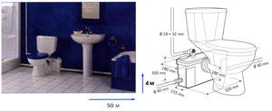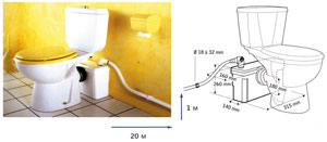 Сам насос располагается, как правило, за унитазом, где он менее заметен. С унитазом соединяется с помощью гибкой резиновой муфты. Отвод сливов из раковины, ванн и т.д. (так называемые «чистые стоки») обеспечивается пластиковыми трубами диаметром 40 мм, присоединяемыми к насосу. Эти стоки должны попадать в насос «самотеком». В самом насосе установлены входные и выходные обратные клапаны, препятствующие обратному ходу стоков.