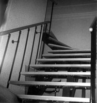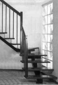 На какой стадии строительства должно происходить обращение в фирму, изготавливающую лестницы, чтобы избежать перечисленных ошибок? Есть клиенты, которые нанимают и архитектора и дизайнера, а к нам приходят уже с готовым проектом и просят воплотить его в металл и дерево. Проект хороший и его действительно можно смело реализовывать. Но так бывает не всегда, прежде всего потому, что не каждому по карману нанять грамотного архитектора. Во многих случаях люди делают и проект дома, и проем под лестницу на свой страх и риск. Вот с ними, как правило, и бывают накладки, потому что обращаются они к нам тогда, когда у них уже завершены отделочные работы и нет только лестницы. Начинать заказывать лестницу надо, по крайней мере, до начала внутренней отделки. Тогда еще есть возможность внести какие-то изменения в ширину проема и т.д. и таким образом исправить ошибки строительства. Но лучше всего сразу же по завершении строительства смонтировать каркас лестницы, закрыть полиэтиленовой пленкой и проводить отделочные работы. В этот момент можно смело и закладные элементы устанавливать, если таковые необходимы, и многие другие работы проводить, не боясь испортить отделку. Когда отделка будет завершена и вся мебель встанет на свои места, можно будет снять полиэтилен и установить деревянные ступени и поручни. Маршевые лестницы. В наиболее простом случае это прямые лестницы, состоящие из одного пролета. Но маршевые прямые лестницы - это довольно редкий случай, поскольку такая лестница занимает максимум площади. Гораздо чаще маршевые лестницы делаются с поворотной площадкой. Чаще всего поворот выполняется на угол 90° или 180°, но возможно устройство поворота и на любой промежуточный угол, если этого требует архитектура лестничного проема. В большинстве же случаев маршевые лестницы - это лестницы, состоящие из одного или нескольких прямых участков, соединенных поворотными площадками или разворотом с веерным расположением ступеней. Чем хорошо веерное расположение ступеней? Такое их расположения позволяет одновременно и разворот устроить и на этом развороте одновременно набирать высоту подъема. То есть, если поворотная площадка - это как бы одна ступень, то при веерном повороте на месте площадки можно устроить несколько ступеней. Кроме того, разворот с веерным расположением ступеней дает возможность сделать основные марши более пологими. В ряде случаев он дает возможность вписать лестницу в такой проем, в который лестница с прямыми площадками просто не вписывается. В общем, такие лестницы хороши именно там, где надо сэкономить место, но все-таки есть возможность установить не винтовую, а лестницу с прямыми маршами. Основой маршевой лестницы чаще всего служит цельная металлическая балка - косоур. Несущих балок может быть одна - при устройстве узких лестниц или две - при устройстве более широких. Косоур узкой лестницы может быть изготовлен не только из прямой одинарной балки, но и собран из отдельных элементов, свариваемых между собой. Пример такой лестницы можно видеть на фото слева. Выглядит такая лестница довольно необычно и очень изящно. Кроме того, применение наборного сварного косоура дает возможность изготовить лестницу необычной геометрии. Не менее эффектно выглядит и еще один тип лестниц - консольные. Один конец ступени таких лестниц з
