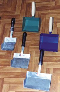 Наша фирма, исходя из многолетнего опыта остановилась на продукции фирмы «Полимикс» (Белоруссия). Разработчики этой фирмы очень тесно сотрудничают с наукой, причем с самой современной, благодаря чему делают просто великолепные смеси, не уступающие по качеству многим импортным. Надо обратить внимание читателей на то, что при производстве работ в зимнее время рекомендуется применение зимних клеевых растворов или специальные противоморозные химические добавки. Для размешивания сухой смеси при приготовлении клея обязательно понадобится мешалка - вставка в ручную дрель. Без неё в этом деле просто не обойтись, поскольку процесс приготовления смеси в корне отличается от процесса приготовления кладочного раствора. Если при приготовлении раствора воду заливают в смесь и замешивают, то здесь наоборот - смесь засыпается в воду и быстро замешивается. И без специальной мешалки и электродрели этого просто не сделать. После размешивания смесь должна отстояться в течение 10 минут, затем её необходимо повторно перемешат. Только после этого она считается готовой к применению. Время живучести смеси составляет от получаса до полутора часов, в зависимости от того чьего производства сухую смесь Вы используете (время живучести производитель указывает на упаковке). Во всех случаях, после того как Вы уложили блок на клей, можно этот блок двигать еще как минимум полчаса. При укладке блоков ячеистого бетона на клей следует использовать специальные зубчатые кельмы. Их использование обеспечивает толщину слоя от двух до трех миллиметров. Работать рекомендуем со специальными полимерминеральными клеями, позволяющими получить и достаточную пластичность и достаточную адгезию. При слое клея 2-3 мм мостики холода в стене просто отсутствуют, тогда как при кладке на обычный раствор, его толстый слой и является мостиком холода. При затратах на приобретение такой кельмы порядка 350 рублей Вы избежите массы неудобств и ненужных дополнительных расходов. Если обычного раствора необходимо порядка 300 кг на один кубометр кладки, то расход клея на тот же объем составит всего 27 кг. При этом отходы раствора составляют около 15-17%, то отходов клея просто нет. Кельма выбирается размером соответствующим ширине укладываемых блоков. Она при этом будет на 10 мм уже ширины блока (они специально так рассчитываются, например, для блока 300 мм ширина кельмы соответствует 290 мм). Благодаря такому размеру клей при нанесении на блок за его края просто не попадает. Для выравнивания блоков при укладке применяются специальные резиновые киянки, предотвращающие повреждения блоков при этой операции. Этот инструмент уже появился на нашем рынке. Для резки блоков профессиональные строители применяют ленточные пилы (иногда электрические и бензопилы). Для ручной резки мы рекомендуем специальные пилы с победитовыми или алмазными зубьями. Это профессиональные инструменты, которые стоят порядка 100 у.е. Такой инструмент подходит только для профессионалов. А частному застройщику какой инструмент применять? Если Вам строит дом специализированная бригада, то этот вопрос Вас даже волновать не должен. Они-то и будут применять и ленточную пилу и специальные ручные пилы с покрытыми алмазной крошкой зубьями. Если же Вы строите дом своими силами, то применять можно самый обычный инструмент - двур