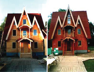 Дома покрыты по следующим системам: Защита стен из брёвен или бруса. ЁЛессирующими материалами: грунтование составом Валтти-Похьюсте, покрытие двумя слоями цветного антисептика Валтти Акваколор или Валтти Колор, или 1 - 2 слоями Валтти Колор Сатин; ЁКроющими материалами: грунтование составом Валтти-Похьюсте, защита сучков лаком Оксалакка, защита шляпок гвоздей и других металлических деталей противокоррозионной грунтовкой Ростекс, покрытие двумя слоями кроющим антисептиком Винха; Защита обшивочных досок. ЁЛессирующим материалом: грунтование составом Валтти-Похьюсте, покрытие двумя слоями цветного антисептика Валтти Колор, Валтти Колор Сатин, Валтти Колор Экстра или Валтти Акваколор; ЁКроющими материалами: грунтование составом Валтти-Похьюсте, защита сучков лаком Оксалакка, покрытие двумя слоями кроющего антисептика Винха или масляной краски Техо или акрилатной краской Пика-Техо. ТИКУРИЛЛА дает гарантию 5 лет на покрытия, выполненные ее красками и пропитками при условии соблюдения технологии нанесения, другие фирмы называют свои гарантийные сроки. А что делать владельцу дома, когда эти гарантийные сроки истекут и понадобиться (не дай Бог) ремонт покрытия. Ремонтную окраску рекомендуется проводить краской такого же типа, которой поверхность была окрашена и ранее. Само собой разумеется, что самый лёгкий способ опознания лакокрасочного покрытия - это верная память, а еще лучше сохраненная документация о применённых красках. Однако типы красок можно часто опознать и визуально по их свойствам. Латексная краска обычно имеет поверхность, похожую на кожу. Она меньше и позже мелит, чем масляная краска. Латексная краска чаще растрескивается по направлению волокон древесины, а масляной краске свойственно клетчатое или поперечное растрескивание. Кроме того, плёнка латексной краски эластичная и её можно свернуть в рулон. Если плёнка ломается или разрушается, то это обычно алкидная или масляная краска. Теперь непосредственно о составах для ремонта. Поверхности, покрытые ранее декоративно антисептическим составом: ремонтную окраску можно выполнить антисептиками Валтти Колор, Валтти Акваколор, Валтти Колор Экстра. Для полной замены цвета применяется кроющий антисептик Винха. Составы, предлагаемые в гамме бытовых антисептиков отличаются устойчивостью и высокими эксплуатационные характеристиками. ВАЛТТИ КОЛОР САТИН в этом отношении просто чемпион. Несколько уступает ему ВАЛТТИ КОЛОР ЭКСТРА. Но все равно, любая из них стоит не менее пяти лет (если, конечно, покрытие нанесено без нарушений технологии). Поверхности, покрытые ранее масляными красками: для ремонта рекомендуется масляная краска Техо. Поверхности, покрытые ранее акрилатными красками: ремонт производить акрилатной краской Пика-Техо. Все перечисленные Вами средства относятся к так называемым "бытовым краскам", но, на сколько известно, фирма Тиккурила выпускает целую серию "промышленных" составов, некоторые из которых мы уже упоминали в своих обзорах. Здесь тоже есть свои секреты и изюминки? Секреты и изюминки есть в любом деле. Обязательно. В гамме промышленных составов мы так же предлагаем системы покрытий, о которых мы расскажем чуть ниже. А в чем заключается разница между "бытовыми" составами и "промышленными"? Разница между промышленными и бытовыми покрытиям