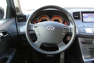 В сущности, Infiniti M45 – тоже спортсмен в костюме. Однако никаких кривых ног под отглаженными брюками или других недостатков обнаружить не получается, потому что машина эта так же элегантна, как и спортивна. Вполне может использоваться как представительский автомобиль с водителем, хотя непонятно, зачем Петровичу вентилировать задницу. Может быть, социальная ответственность бизнеса. Петровичу также жалко отдавать в постоянное пользование удивительно красивое рулевое колесо, первое сравнительно тонкое колесо, мне понравившееся. Жалко и аналоговые часы, подсвеченные как будто лунным светом, хотя их видно и с заднего подогреваемого дивана. Жалко и удивительной красоты такую же лунную надпись Infiniti на порогах передних дверей, которую пассажир сзади может за все время эксплуатации машины вообще ни разу не увидеть.