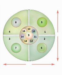 Выделите на даче участок размером 1,5*1,5 метра, или столько, сколько сочтете нужным. Разделите его на четыре равных зоны, как показано на рисунке. Центральный горшок имеет диаметр 40-50 см, боковые горшки - 25-30 см. Всем растениям нужно хорошее солнечное освещение и нейтральная почва. Горшки должны иметь отверстия для дренажа, чтобы