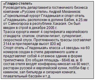А власти Ленинградской области и Санкт-Петербурга просто «попросили» инвесторов построить в чистом поле горнолыжную трассу. Неудивительно, что соинвесторы проекта стоимостью $55 млн. – банк «Россия», «Северсталь» и «Согаз» с радостью откликнулись на это предложение – бизнес каждой из компаний тем или иным образом связан с регионом. В Хакасии инвестором горнолыжной трассы «Гладенькая» является компания «Русские отели» - дочерняя структура холдинга «Базовый элемент». Стоит напомнить о стратегическом интересе «Базового элемента» к этому региону – тут расположены его несколько алюминиевых заводов. Руководитель департамента гостиничного бизнеса компании «Русские отели» Андрей Механиков уверяет, что этот проект – коммерческий. Однако Механиков признается, что и без поддержки местных властей не обошлось.