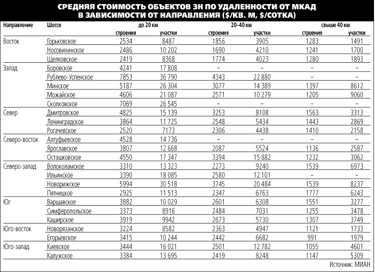 По оценке Натальи Чукаевой, директора департамента маркетингового анализа УК “Масштаб”, по итогам прошлого года земельные участки в зависимости от направления прибавили в цене 70-150%. По данным “МИАН — агентство недвижимости”, средняя стоимость подмосковной сотки на конец декабря 2006 г. составила $8402. Самая дорогая земля — в среднем $36 790 за сотку — традиционно располагается в 20-километровой зоне от МКАД по Рублево-Успенскому шоссе. В 2006 г. сделки, в которых цена сотки превышала $100 000, на Рублевке перестали быть единичными.