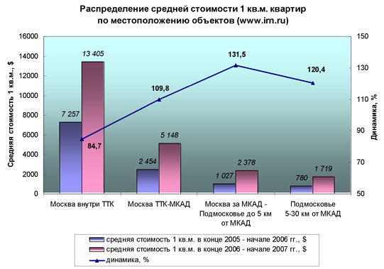 Средняя стоимость 1 кв.м. в конце 2006 – начале 2007 гг., $