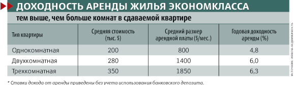 Рассмотрим стандартную однокомнатную квартиру на юго-западе столицы, которая сдается в аренду в среднем за $900 в месяц. На вторичном рынке такое жилье стоит около $210 000. Чистая годовая доходность от сдачи квартиры в данном случае составит 5,1% (средний уровень — 5-6%). Дополнительно можно заработать от вложения получаемых средств на пополняемый банковский депозит (эффективная ставка — около 4-4,5% годовых).