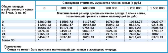 В таблице предельная жилплощадь в собственности равна 30 «квадратам». Иными словами, если у семьи в собственности 30 и больше квадратных метров, то считается, что они жильем обеспечены и статус малоимущих им вообще не светит.