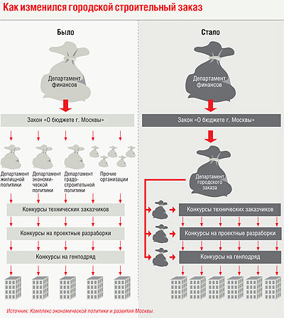Возвращение Главмосстроя До последнего времени финансирование бюджетного строительства проходило через 28 городских ведомств. Это прежде всего департамент жилищной политики, который был заказчиком всего жилья, строящегося по городскому заказу. Затем -- градостроительный департамент, в ведении которого находились все инфраструктурные проекты, прежде всего дороги. И наконец, департамент экономической политики, через который проходила вся "социалка": школы, детские сады и прочее. Кроме того, были отраслевые заказчики помельче: скажем, за стадионы отвечал комитет по физкультуре и спорту, за кинотеатры -- комитет по культуре и т. д.