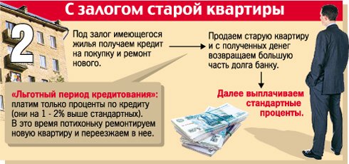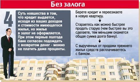 Самая новая и весьма удобная схема (см. 4). Рассмотрим на примере. Вы берете кредит, который банк выдает, исходя из ваших доходов и стоимости имеющегося у вас жилья. Причем не оформляя в залог эту квартиру. Спокойно выбираете и покупаете себе квартиру, вселяетесь в нее и начинаете продавать свою. Причем первые полгода в банке вы можете не появляться, процентов платить не нужно! И чем быстрее вы продадите свою квартиру (а будет она опять же продаваться как свободная!), тем меньше банку заплатите! В любом случае выигрыш очевиден как в деньгах, так и в условиях проведения сделки.