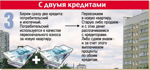 Есть еще вариант - можно взять сразу два кредита: один потребительский - под залог старой квартиры, а другой ипотечный - под залог новой (см. схему 3). Потребительский кредит получить проще, хотя ставки по нему несколько выше, чем по ипотечным. Полученные таким образом деньги пойдут в качестве первоначального взноса за вашу новую квартиру прямым назначением в банк, выдавший обычный ипотечный кредит . Таким образом, вы становитесь собственником сразу двух квартир, которые хоть и находятся в залоге, но, как известно, это абсолютно не мешает жить в них, сдавать внаем (внося из этих средств проценты за кредит) и даже продавать. И как вы ими распорядитесь - решать уже вам. Вы можете продать старое жилье и погасить выданный под него кредит. А можете оставить обе квартиры, одну из них сдавать и спокойно выплачивать проценты по двум кредитам. Такая схема подойдет для людей, способных рискнуть, но вместе с тем имеющих хорошую работу, стабильный доход и твердо стоящих на ногах.