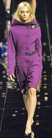 Фиолетовый. За последние годы мы привыкли скорее к оттенку фуксии, чем к более холодному фиолетовому. Так что дизайнеры нас в этом сезоне приятно удивили, сделав акцент именно на фиолетовом. Как оказалось, он так же одинаково хорош с тканями разной фактуры. Похожие минималистские платья прямого силуэта без рукавов при этом выглядят совершенно по-разному: из гладкой тонкой шерсти от Lanvin – строго и по-деловому, из мягкой шерсти с ворсистой поверхностью от Alberta Ferretti – романтично и женственно. Дальше всех пошел по пути эксперимента Дом моды Dior, представив целую коллекцию мехов в фиолетовой гамме. Аксессуары же практически все дизайнеры в этом варианте предлагают черные.