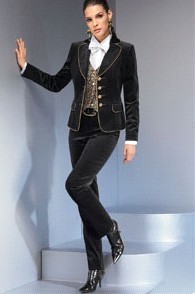 При выборе костюма нужно обращать внимание не только на фасон, но и на ткань. Костюм из бархата - для особо торжественного случая. Не последнюю роль играет и жилет. Он может быть пошит из дорогостоящей парчи с блестящими пуговицами (золотого или серебряного цвета). Спинка выполнена из сатина. Блузка может быть не только в тон костюма, но и белого цвета. Может быть украшена стразами или вышивкой. И завершает композицию лаковый ремень шириной 4-5 см.