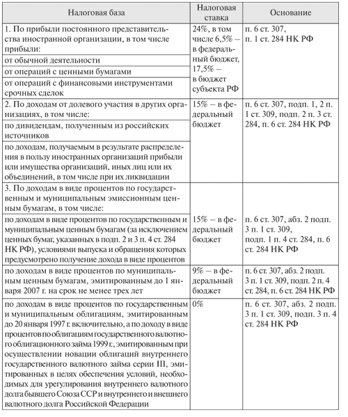 Ставка налога на прибыль постоянного представительства иностранной организации, в том числе на его прибыли от обычной деятельности, от операций с ценными бумагами и от операций с финансовыми инструментами срочных сделок, равна 24 процентам (6,5% – в федеральный бюджет, 17,5% – в бюджет субъекта РФ). Ставки налога на прибыль для указанных и других видов дохода, которые может получать постоянное представительство, приведены в таблице.