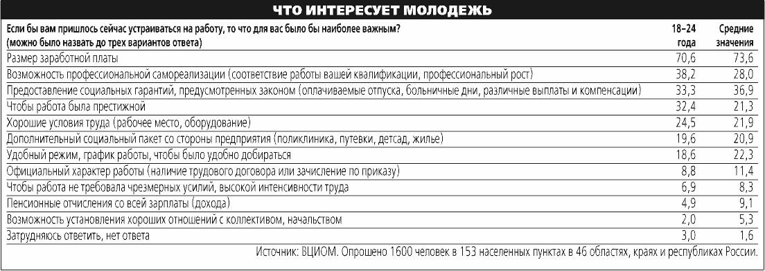 Молодежь является самой прагматически настроенной возрастной группой, комментирует руководитель направления корпоративных исследований ВЦИОМ Юлия Верлина. “Они в большей степени, чем старшее поколение, ориентированы на заработок, возможности профессиональной реализации и карьерного роста, на имя компании, на престиж работы”, — говорит она. В меньшей степени они заинтересованы в социальных гарантиях и стабильности. “Как это ни печально для работодателей, при лучших условиях, в частности при более высокой зарплате, молодые сотрудники с легкостью сменят работу”, — говорит Верлина (см. таблицу).