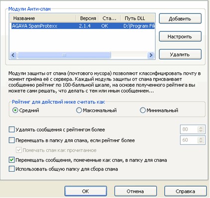 Рейтинг может пониматься как средний, минимальный и максимальный. От выбора этих установок зависит направление действий функций программы. Если выбрано понимание рейтинга как минимальное, то все активизированные функции применяются к письмам с рейтингом выше установленного. Если выбрано понимание рейтинга как максимальное, то наоборот. Для неопытных пользователей либо тех, кому лень возиться с настройками, рекомендуется оставить выставляемое по умолчанию понимание рейтинга как среднее.