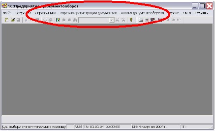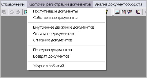 Все работа в программе осуществляется через программное меню, и в основном, через три его пункта: «Справочники», «Карточки регистрации документов», «Анализ документооборота». Каждый из этих пунктов имеет свои подпункты, которые и вызывают различные программные модули: справочники, документы, отчеты.