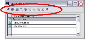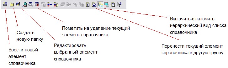 В окне списка справочника можно работать с элементами этого справочника. И для этого оно имеет в верхней части панель кнопок. Каждая кнопка позволяет выполнить некоторое действие в окне справочника. Если подвести мышь к кнопке, то появится подсказка, говорящая, что эта кнопка делает.