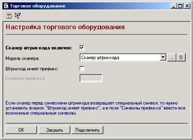 Подключить сканер можно вызвав из меню «Сервис» обработку «Торговое оборудование» и следуя дальнейшим указаниям.