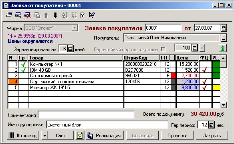 Документ «Заявка от покупателя» внешним видом очень похож на документ «Сборочная единица». Приемы работы справедливые для «Сборочной единицы» полностью совпадают с приемами работы с документом «Заявка от покупателя». Однако документ обладает некоторыми индивидуальными особенностями. Он предназначен для того, чтобы зарезервировать товар для покупателя до момента реализации. Как следствие, он имеет поле редактирования «Покупатель». Так же он содержит список для выбора фирмы, поскольку продажа будет вестись от конкретной фирмы, пользующейся общим складом.