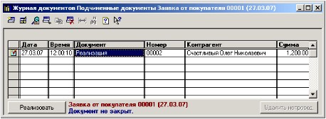 Реализация возможна только из документа «Заявка от покупателя». Для этого в документе предусмотрена кнопка «Реализация». Нажав на нее, Вы переходите в журнал реализации по данному документу. Здесь видно, что один документ реализации уже есть. Все что вы можете сделать в журнале, это работать с уже имеющимся документом, либо создавать новые.