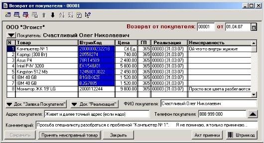 К сожалению – ничто не совершенно. Нет абсолютно надежных товаров. И вот покупатель обратился с проблемой. Он не доволен своей покупкой. Для этого существует документ «Возврат от покупателя».