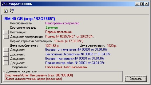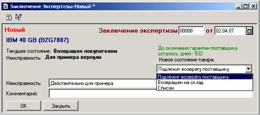 Примечание: возвращенные покупателем товары имеют состояние «Возвращен покупателем». Затем с помощью документа «Заключение Экспертизы» ему можно придать состояние: «Списан», «Возвращен на склад» или «Подлежит возврату поставщику». В последнем случае товар может быть отправлен по гарантии поставщику документом «Возврат поставщику». Вернуть товар из гарантийного ремонта можно документом «Возврат по гар.обяз.» (возможна замена товара). Особый случай, когда товар был отправлен поставщику и по каким-то причинам не может быть возвращен обратно (поставщик прекратил свою деятельность или …. что угодно) на товар, находящийся в состоянии «Отправлен поставщику» (достигается документом «Возврат поставщику») можно вновь оформить документ «Заключение Экспертизы» и придать состояние товару «Списан». Товар, принятый от поставщика по документу «Возврат по гар.обяз.» может иметь три состояния: «Возвращен на склад», «Заменен» и «Возвращены деньги».