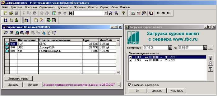 Открыв справочник «Валюты» и нажав на кнопку «Загрузить курсы» Вы имеете возможность загрузить курсы валют за любой период.