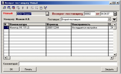 При создании нового документа из обработки определяется поставщик выбранного Вами товара и все товары, подлежащие отправке этому поставщику (в состоянии «Подлежит возврату поставщику»). На основании выборки заполняется табличная часть документа. При этом также проверяются другие поставщики, и если им необходимо возвращать товар, то поставщик попадает в список поставщиков, в адрес которых можно вернуть гарантийный товар. Выбор из этого списка организован из поля «Поставщик» документа (при смене поставщика табличная часть перезаполняется). Менеджер – это менеджер поставщика, занимающийся Вами.