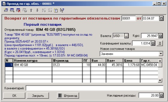 Документ можно оформить, не заполняя поле «Поставщик», хотя это не желательно, если Вы решили впоследствии реализовать товар, оприходованый по данному документу, дав свои гарантийные обязательства. При возврате товара покупателем будет невозможно переадресовать гарантийные обязательства поставщику. Так же необязательно заполнение полей, связанных с гарантийными талонами и периодом гарантии. При возврате товара покупателем Вам необходимо будет вручную поднять необходимые бумаги, что бы определить – можете ли Вы отправить товар поставщику по его гарантийным обязательствам.