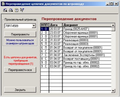 Кроме того, обработка позволяет ввести любой штрихкод и просмотреть в каких документах он использовался, а при необходимости и перепровести эти документы (можно открыть документ – двойной клик левой кнопки мыши на нужном документе).
