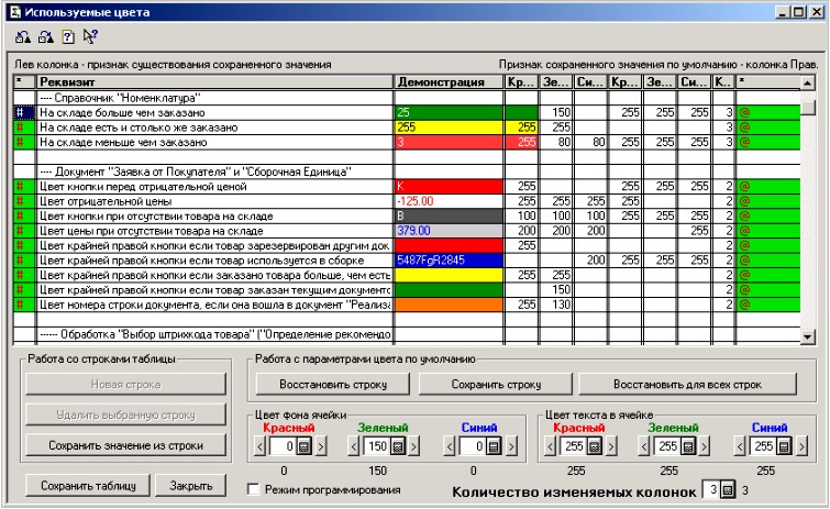 В табличной части обработки Вы видите настраиваемые переменные, используемые в конфигурации, для придания некоторым формам большей информативности. Все переменные разбиты на группы по принадлежности их к той или иной форме. Перемещаясь по строкам Вы можете настраивать (изменять) предложенные цветовые решения. Для этого в правой нижней части обработки есть поля редактирования. Изменение значений сразу же будут видны в соответствующей строке формы. Настроенное значение можно сохранить как значение по умолчанию, либо восстановить предыдущее значение по умолчанию для одной строки или для всех. Для этих операций существует набор кнопок «Работа с параметрами цвета по умолчанию».