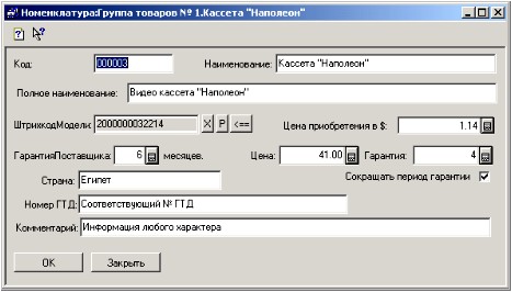 Поле «Наименование» - желательный элемент для заполнения, поскольку в нем хранится номер гарантийного талона поставщика, дающего нам право воспользоваться гарантийными обязательствами.
