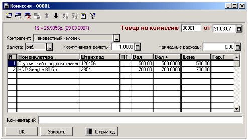 Документ «Комиссия необходим для того, чтобы иметь возможность принять на склад товар, уже бывший в употреблении, либо из ненадежных источников. Принятый этом документов товар имеет специальную пометку – «К» (комиссионный). Она будет видна Вам при оформлении документов «Сборочная единица» и «Заявка от покупателя».