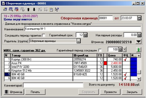 На рисунке приведен пример оформления сборочной единицы. Следует отметить, что результатом проведения документа явится новый элемент справочника «Номенклатура» в том месте, в структуре справочника, которое Вы укажите. По этой причине необходимо заполнить поле «Наименование» и «Родитель» (если документ проведен – изменение значения в поле «Родитель» приведет к переносу элемента справочника «Компьютер № 1» в другую группу). Поля «Сокращать период гарантии» и «Гарантийный срок» аналогичны полям в форме элемента справочника «Номенклатура», которые и заполнятся из указанных полей документа. Поле «Цена» в справочнике заполнится результатом суммирования полей «Цена» строк документа + «Накладные расходы». В поле «Накладные расходы» Вы можете указать затраты, понесенные Вами в процессе сборки данной сборочной единицы.
