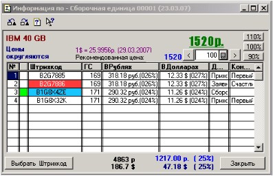 Выбор нужного Вам штрихкода, либо Цены (либо того и другого) осуществляется по двойному клику левой кнопки мыши на нужном Вам штрихкоде (такого же результате добьетесь, если нажмете на кнопку «Выбрать штрихкод»).